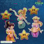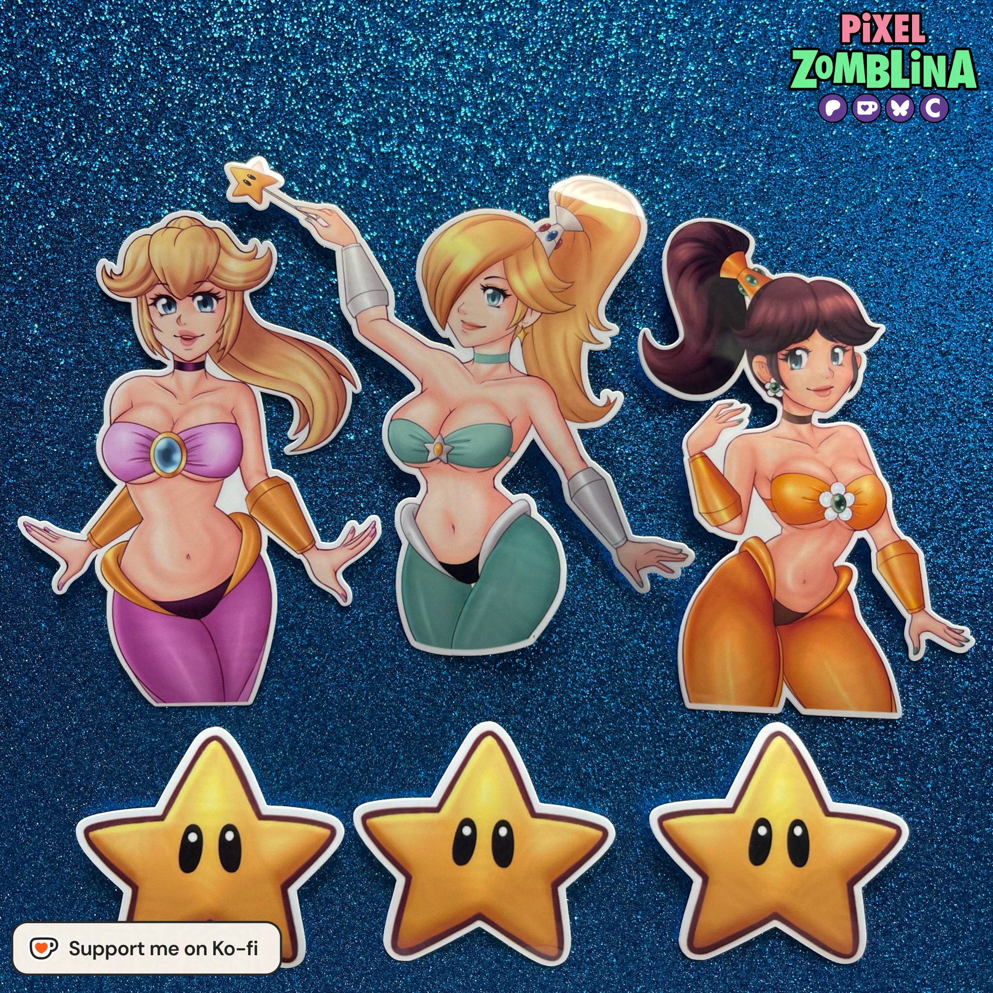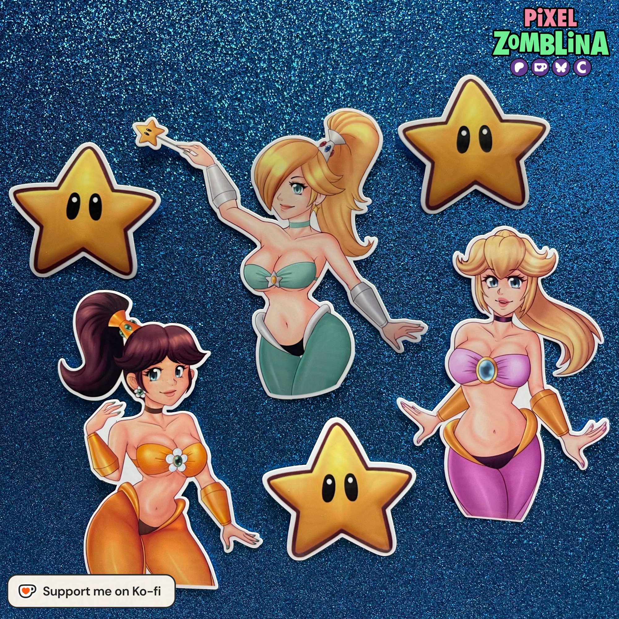 Six (6) glossy stickers featuring Princess Daisy, Peach, and Rosalina in their own special genie suit! Each character comes with a Power Star and is 4 inches tall. All stickers include a laminate to protect it!