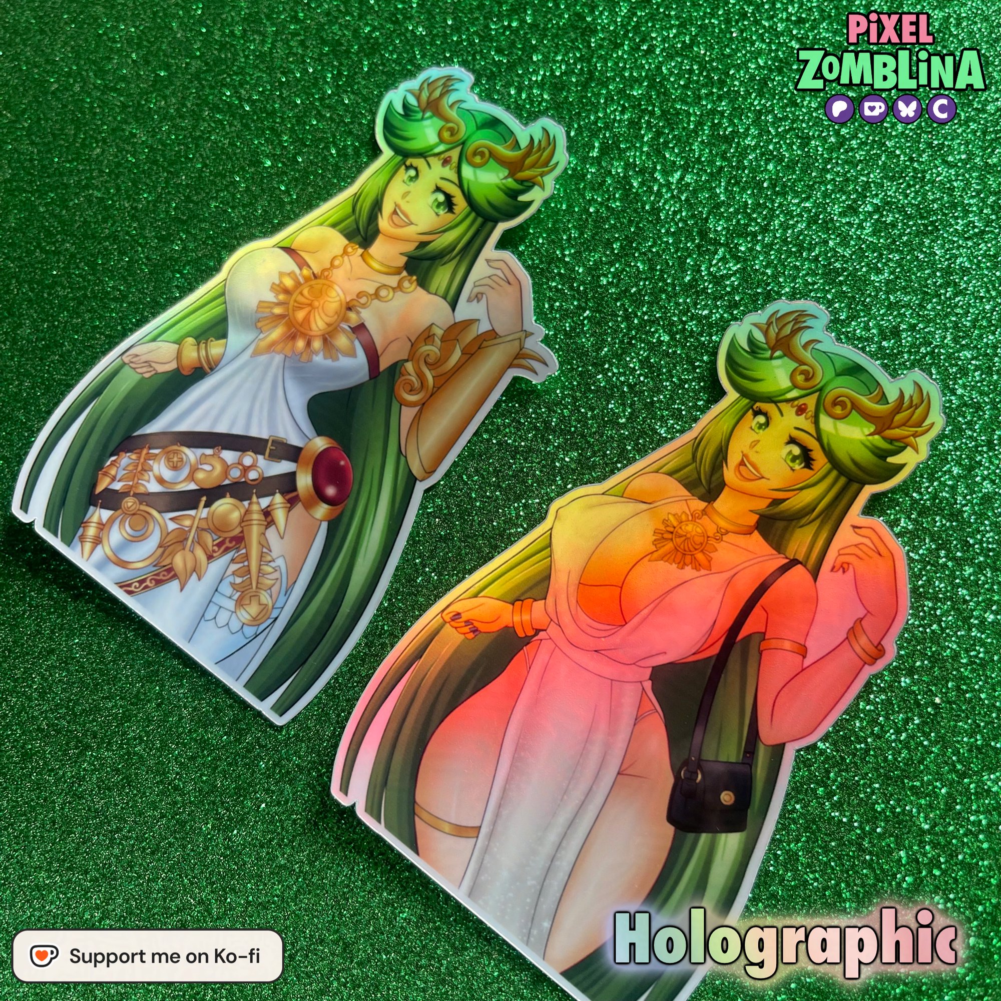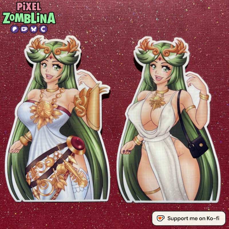 A glossy sticker of Palutena from Kid Icarus! She is 4 inches tall and has a laminate to protect the sticker! There are two variants: Her classic outfit and a party dress designed by @sarukaiwolf.bsky.social!