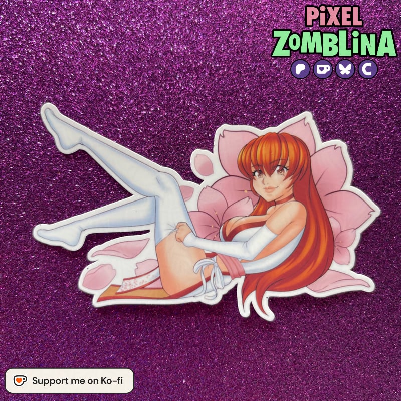 A glossy sticker of Kasumi in her classic outfit from Dead or Alive 2! She is laying on some cherry blossoms. The sticker is 4 inches wide and has a laminate to protect the sticker! Variants include her classic white/red outfit or black/gold outfit.