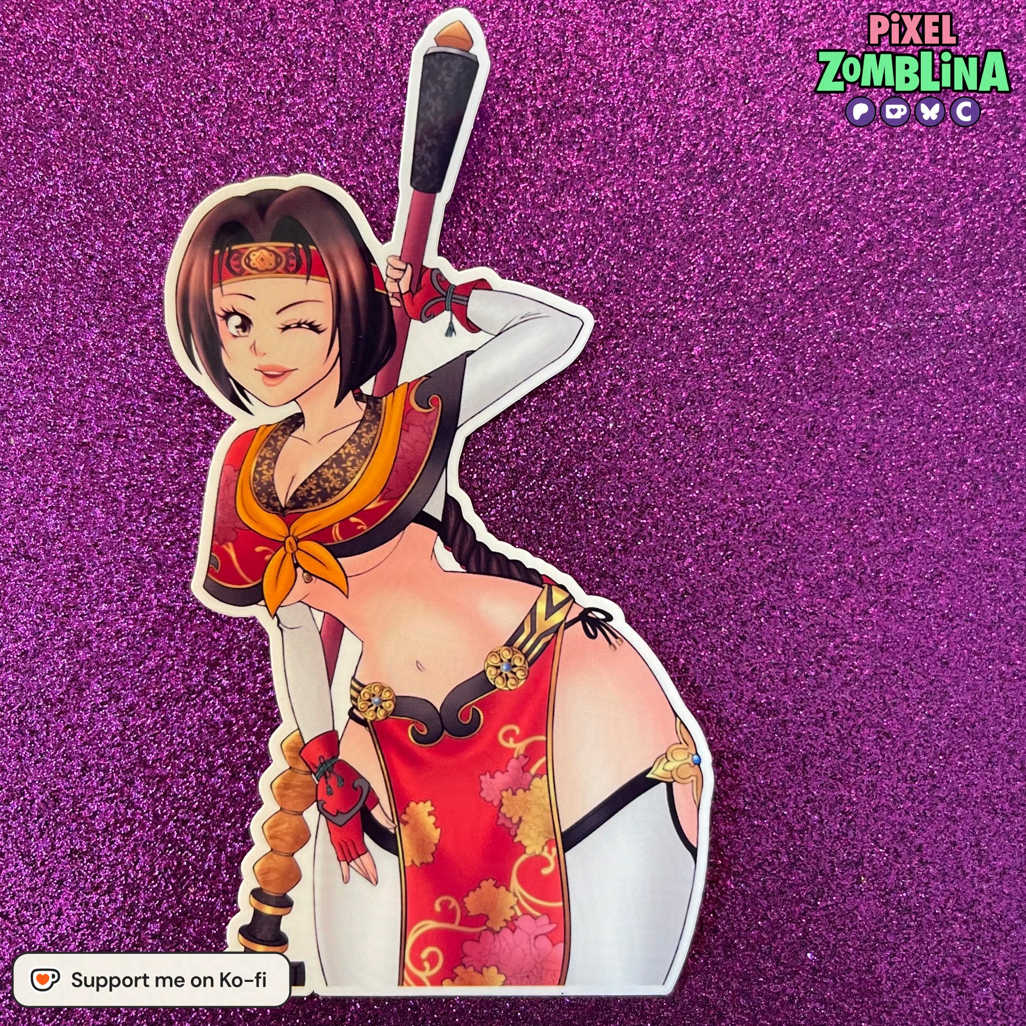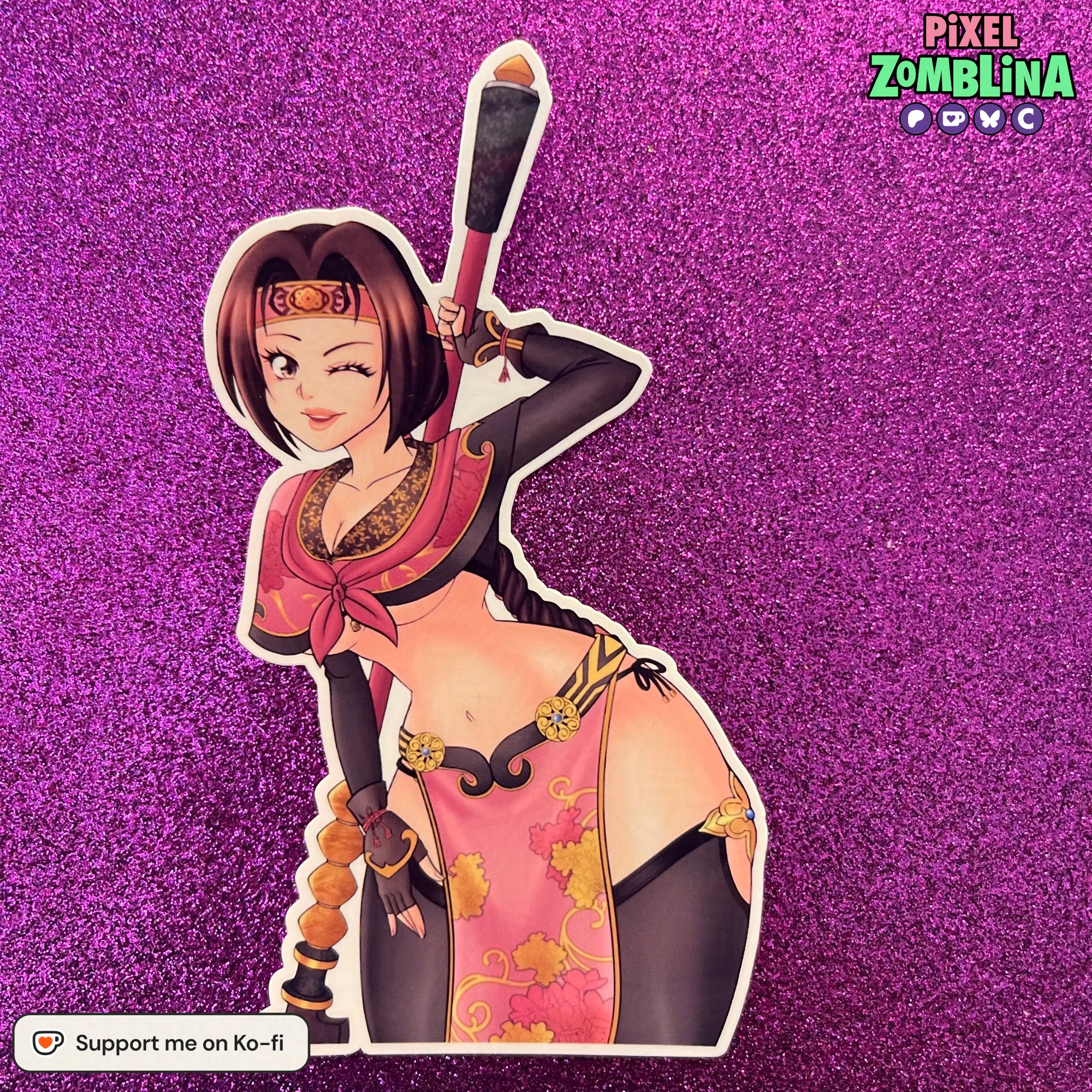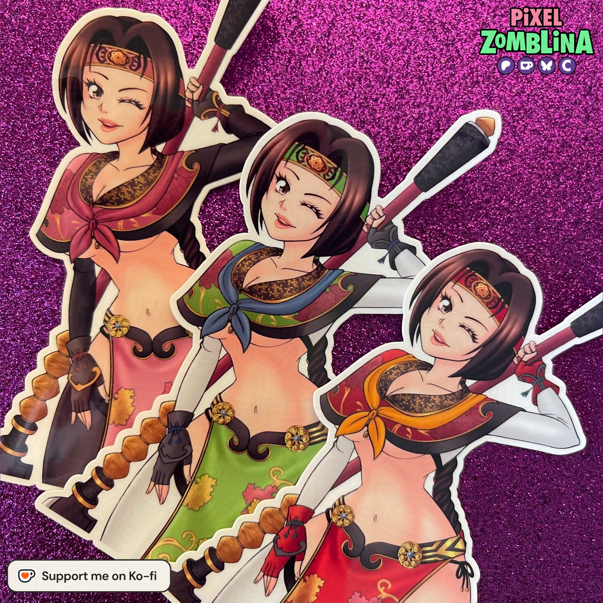 A glossy sticker of Seong Mina from Soul Calibur! The sticker is 4.5 inches tall (with weapon included) and has a laminate to protect it! Three color variants are available.